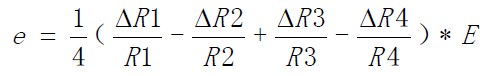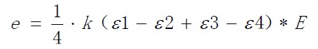 若四枚應(yīng)變片完全相同,比例常數(shù)為K,且應(yīng)變分別為ε1 、ε2 、ε3 、ε4,則上式可寫成下面的形式: